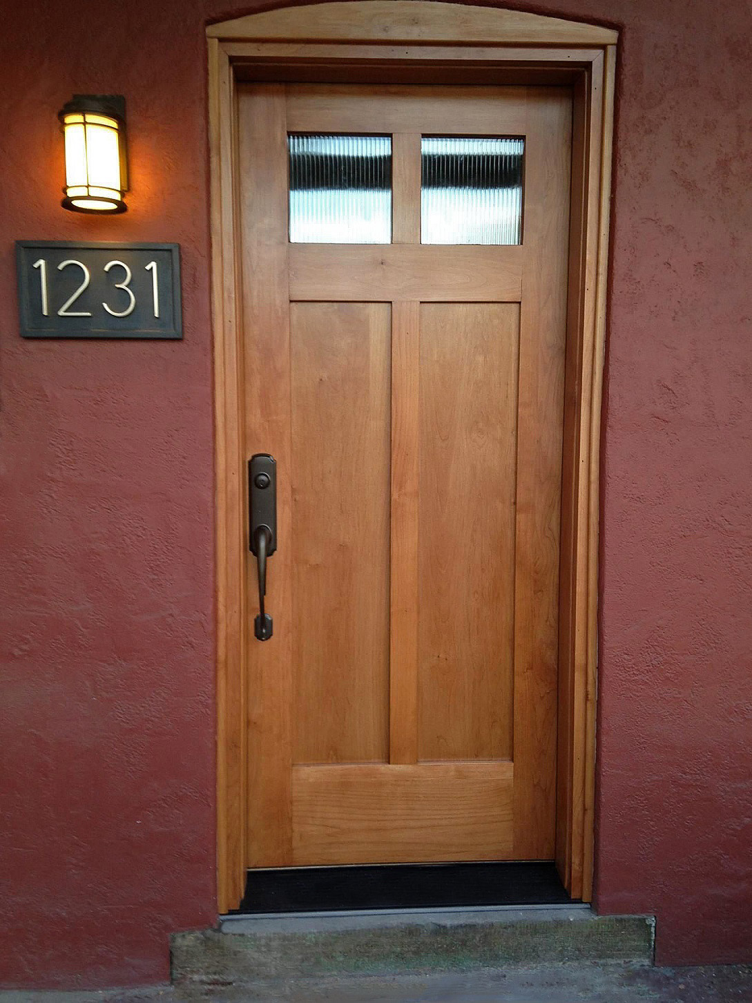 This single 3’x7′ door was installed in historic home in one of the oldest neighborhoods in Denver, CO. Made of Alder, designed with simple and squared details in mind. Includes lower divided flat panels, and upper ‘Reeded’ tempered glass units. 2 1/4″ thick door with multi-point locking mechanism for added security. Direction of door swing was changed from previous door unit to improve flow into the entryway. Designed by architect homeowners.